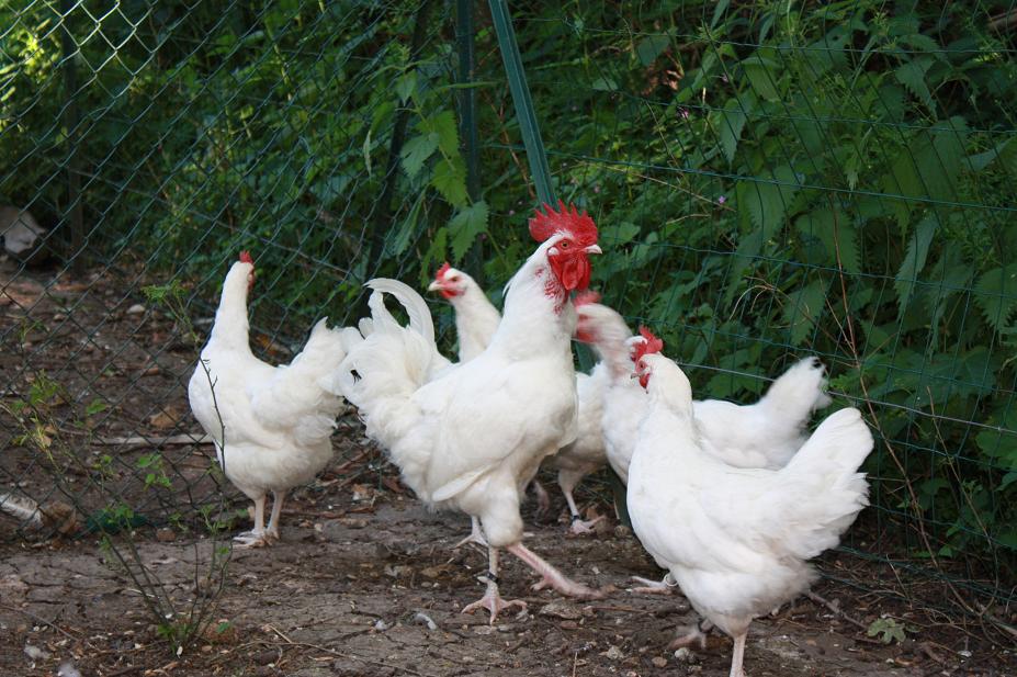 Volaille à colori unique, soit le blanc pur. Attention les pattes doivent être blanches aussi. L'oeillon doit être rouge vif sans trace de blanc. Très bonne pondeuse précoce (entrée en ponte dès 5-6 mois) et souvent bonne couveuse (ce qui montre qu'elle a gardé son instinct, un des indices pour s'assurer que ce n'est pas un croisement hybride indistrielle). Je ne garde que les poules qui ont tendance à couver. Elle donne aussi de très bons poulets en 4-5 mois. Les poussins se développent bien et sont très agiles, très débrouillards. Ne pas les élever avec des poussins à croissance plus lente et plus difficile ( la flèche et barbezieux).